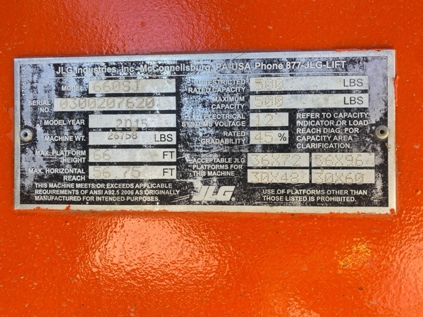 Unit: #3898 Platform Height: 65 ft 8 in. / 20.02 m Platform Capacity Restricted: 750 lb / 340.19 kg Platform Capacity Unrestricted: 550 lb / 249.48 kg Horizontal Outreach: 57 ft 1 in. / 17.4 m NDT: 2019