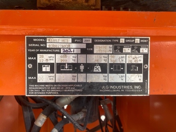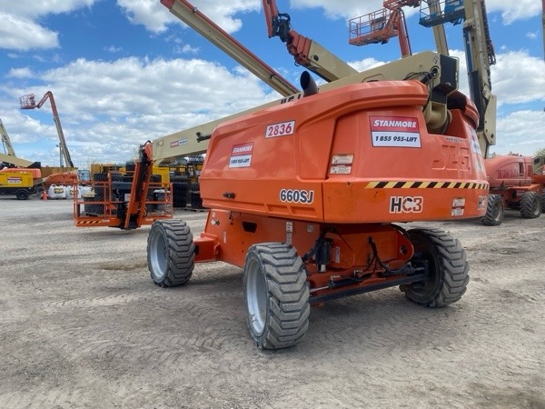 Unit: #2836 Platform Height: 65 ft 8 in. / 20.02 m Platform Capacity Restricted: 750 lb / 340.19 kg Platform Capacity Unrestricted: 550 lb / 249.48 kg Horizontal Outreach: 57 ft 1 in. / 17.4 m NDT: 2019